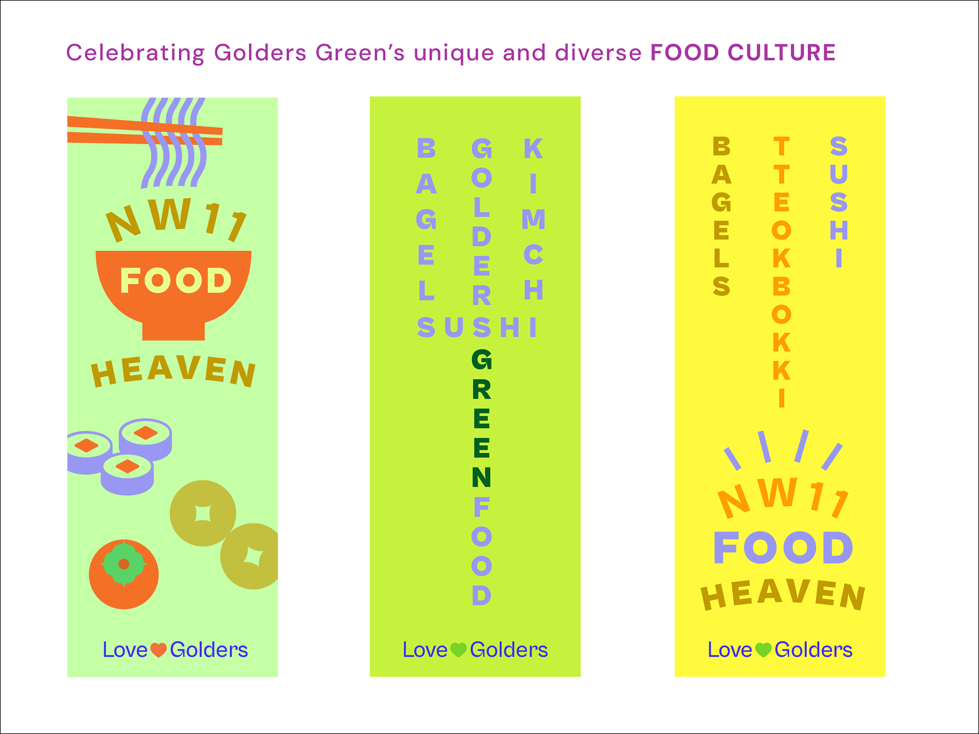Aims: To create a brand campaign for Golders Green by displaying famous iconography of our town. Its famous residents, buildings and diverse international food scene will be signposted for all to see. This will form part of our campaign to promote Golders Green as “NW11 – Food Heaven,” which we feature on our website and social media.