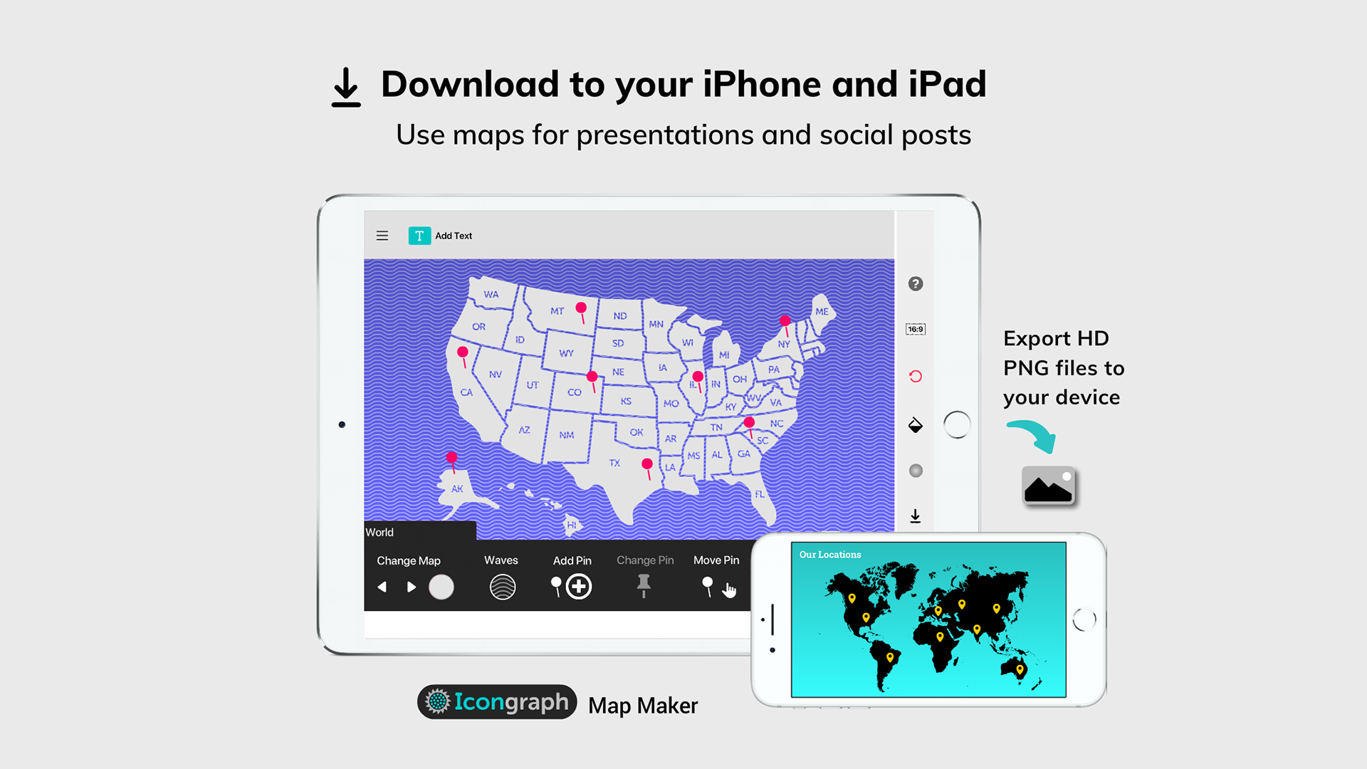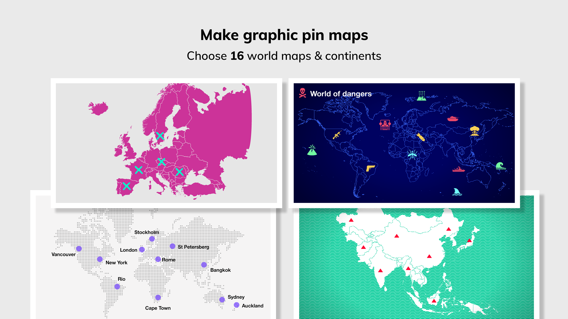 Map Maker is an easy to use tool for making graphic maps with pins and icons. It's included in our larger infographics app 'Icongraph' - available on iPhone and iPad.