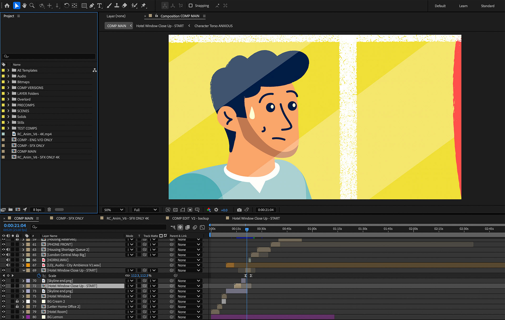 Animation stills: Asylum hotel scenes. Here I started by drawing the hotel scene and a view of the London skyline in the brand's colours. I used artistic license for the Home Office 'refugee status' letter because this was very plain in reality. With an explainer film one needs to get the message across clearly and visually, and icons help to achieve this quickly.